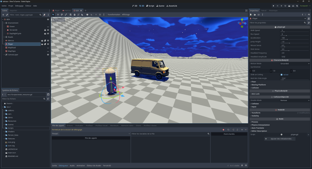 J’ai déjà pas mal avancé sur les bases du projet, les déplacements du personnage et du véhicule ainsi que la gestion de l’aspect survie du personnage (vie, faim, soif, fatigue) et du véhicule (essence, huile, eau, batterie).